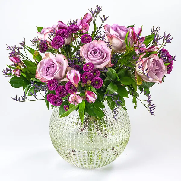 Ein bezaubernder Strauß aus Santini, Rosen, Strandflieder und Inkalilien in lila Tönen, zusammengebunden mit Ruscus. Verschenke purpures Glück!